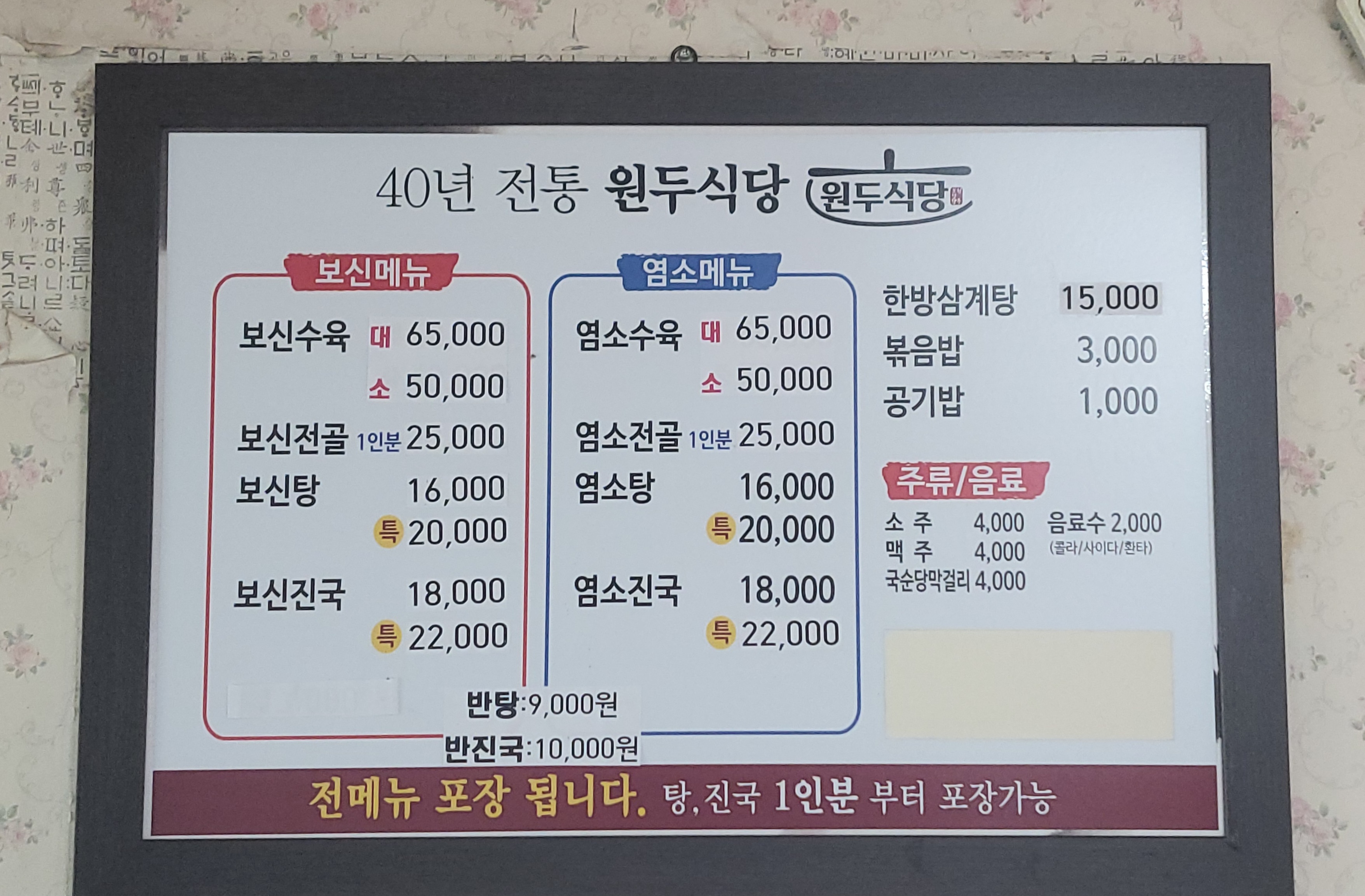 나는 먼저 이 식당의 메뉴(Menu) 표를 점검하고 있는 사이 친구는 능수능란(能手能爛)하게 보양식을 주문하는데, 서울 친구는 염소탕으로 주문하지만 나머지 4명은 보신탕으로 주문을 한다.