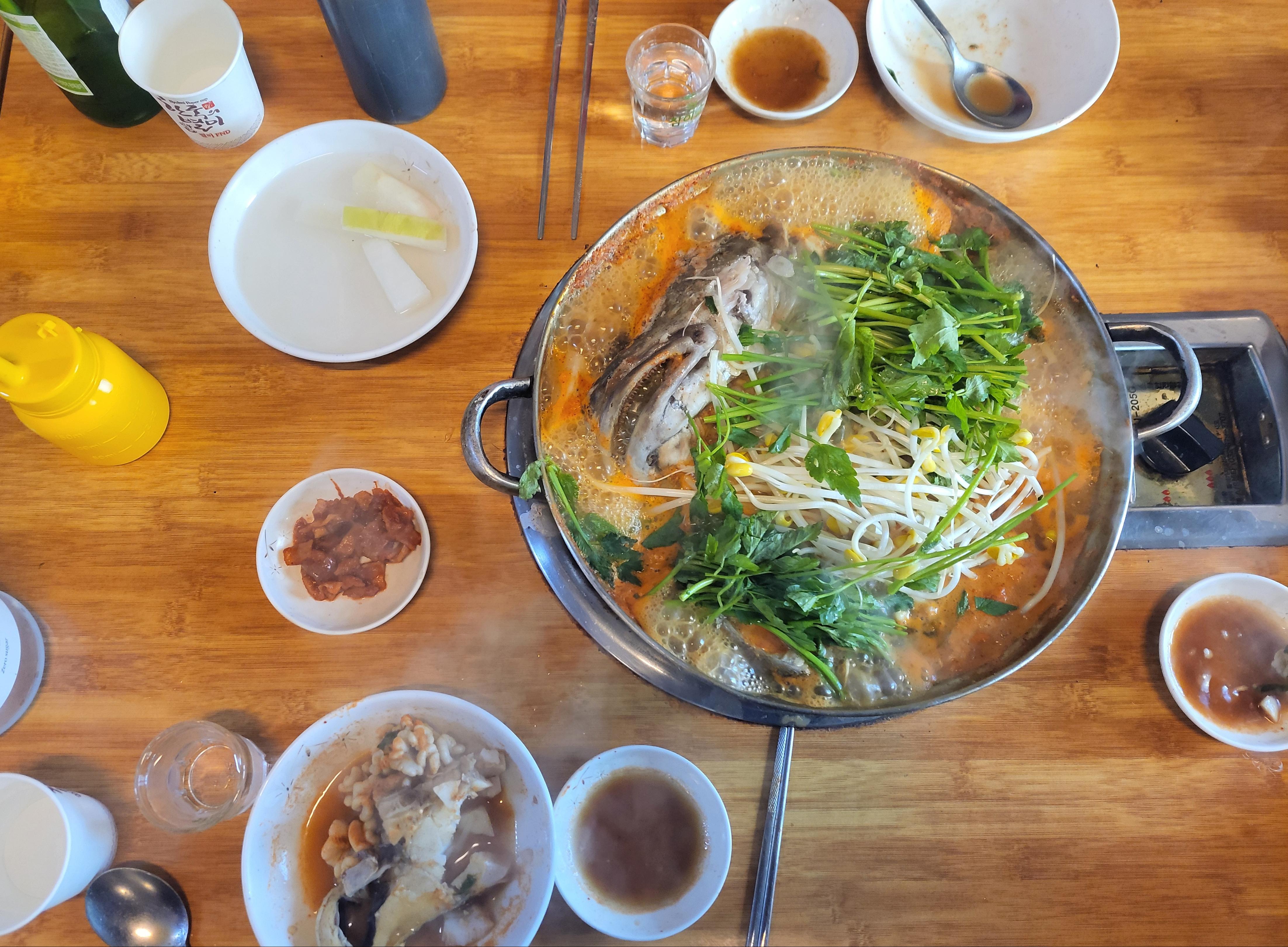 이어 주방에서 1차 요리가 된 대구탕을 가져와 다시 한번 더 요리를 하면서 소주와 함께 먹기를 시작하는데, 너무나 큰 물고기를 사용하여서 그런지 대구탕에는 깊은 맛이 숨겨 있어 숟가락 운동이 바빠진다.