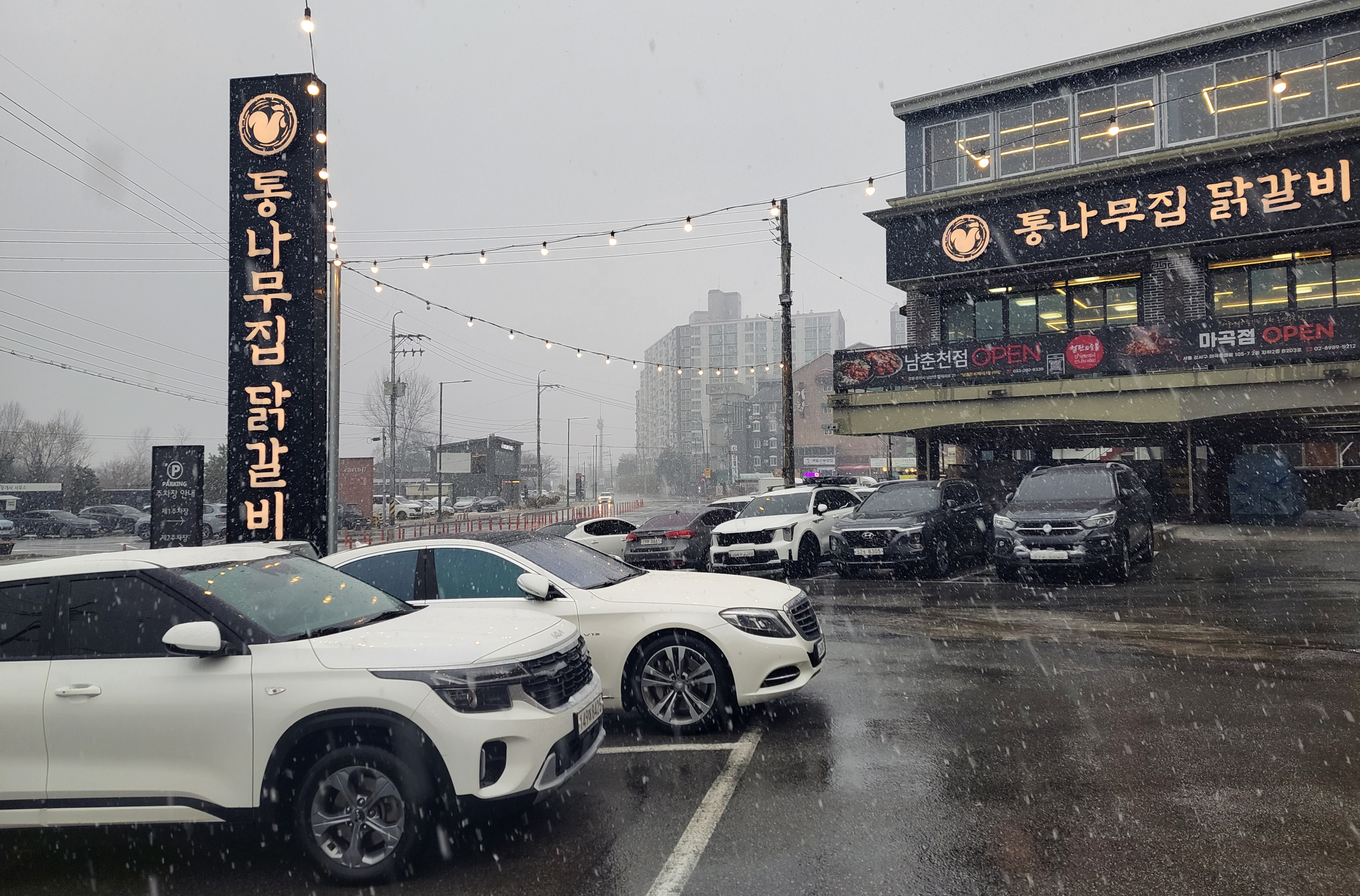 그 많은 식당 중 제일 먼저 '통나무집 닭갈비' 본점 식당이 자리하고 있는데, 현재 점심식사 시간이 훨씬 지나갔지만 그래도 식당 입구에 자리하고 있는 주차장에 많은 차량들이 주차하고 있다.