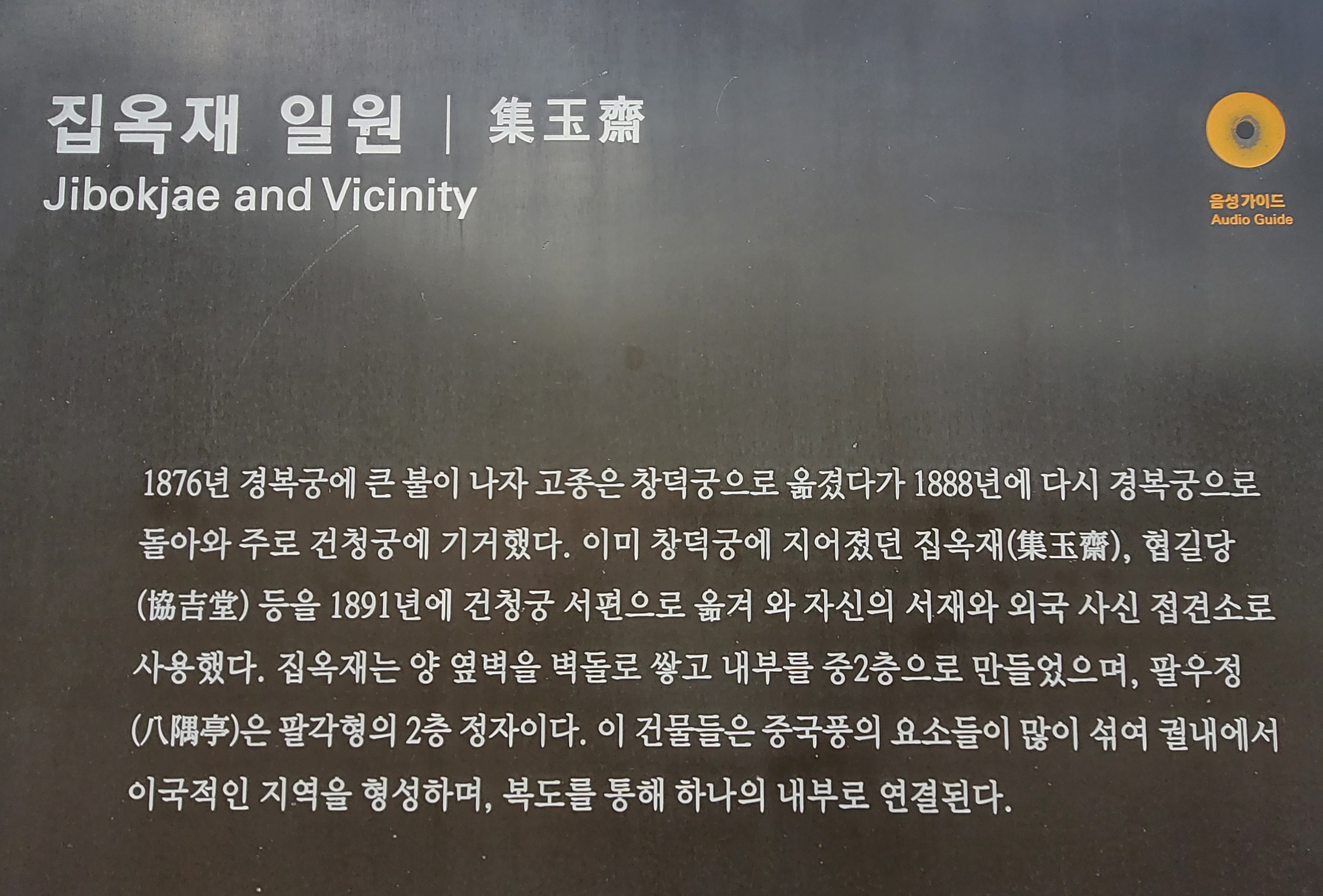 건청궁에서 왼편으로 조금 들어가면 '집옥재(集玉齋)' 건물을 만나는데, 집옥은 ‘옥처럼 귀한 보배를 모으다’ 라는 뜻으로 집옥재를 중심으로 왼쪽에 팔우정(八隅亭) 및 오른쪽에 협길당(協吉堂)이 자리하고 있다.